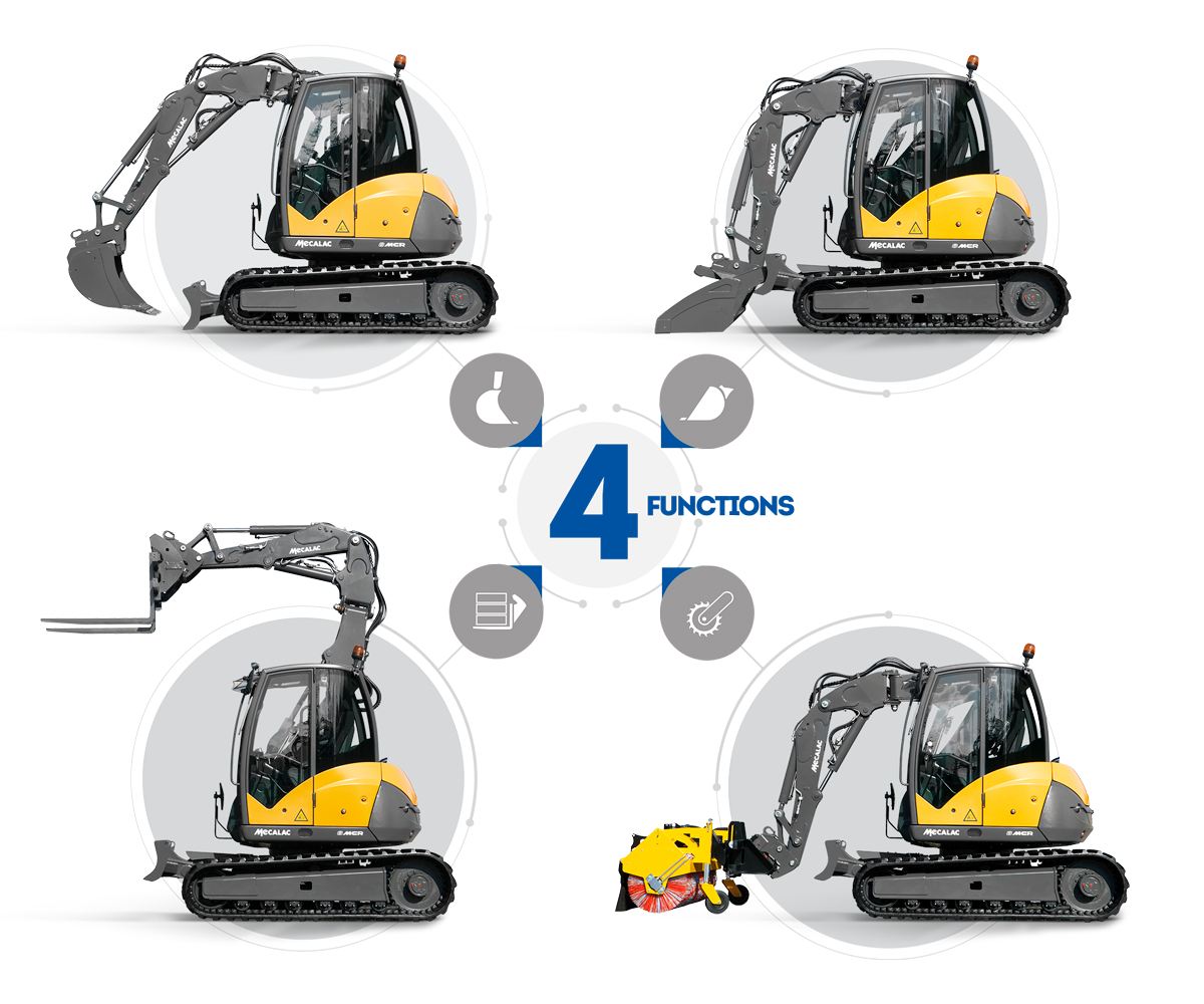Thanks to a simple selector-switch, Mecalac patent, the driver can turn his compact excavator into a compact loader and then back again, using the same commands. Loading efficiency is maximized, it is made by the skid bucket supported on the blade which increases the machine’s efficiency thanks to the force of the thrust transmitted directly from the chassis to the bucket. The operation is performed more accurately using the control lever. The patented Mecalac cylinder coupling function, allows to synchronize the boom cylinders for perfect movement coordination and precision. It makes driving and handling easy, regardless of whether the operator is a novice or more experienced. And, whether engaged or otherwise, they’re yet another powerful feature along for the ride.